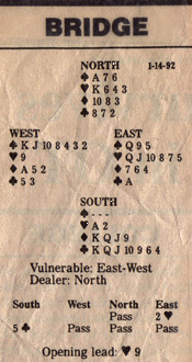 After the Chief passed as dealer, Siegfried, the German who runs a prison camp and dog pound somewhere in New Jersey, opened with a weak two-bid in hearts. This gave Max a problem. Even though his partner was a passed hand, it was still possible that they could make a slam. Yet where were all the spades? He decided to bid the contract he thought he could make: five clubs.