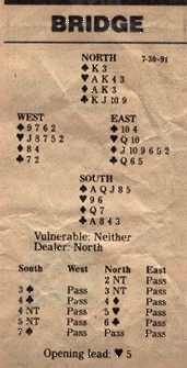 In deal two, the Chief (North) opened two no-trump, showing 21-22 points. Max bid his suits and then used Blackwood to learn that his partner had two aces and four kings. Showing uncharacteristic competence, Max calculated that the club queen was probably missing and that the spade suit was solid. He bid seven spades.