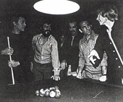 After a sauna, guests cool off--and warm up again--in the Bath House's mirrored playroom (above). Others repair to the Game House (below) for pinball, any of the electronic permutations on Pong or an old-fashioned rack of pool--tonight between Tony Curtis and Jimmy Boyd, coached and kibitzed by Keith Hefner, Joe De Carlo and Don Adams.