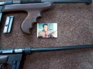 to resemble a Thompson Submachine gun. An avid gun collector, Tim Tim said at first he was skeptical when the man he bought the gun from told him it had been on Get Smart. He grew up watching Get Smart and did not remember the gun from the show. Neither do I. *scratches head* Then a clue turned up --Tim found a magnet in a Half Price Book Store in Dayton Ohio, showing Max holding the gun. Oh! That picture! That magnet was released as part of a set in the late 1990s. I've seen the magnets and the actual 8 by 10 of that image on Ebay. Tim said the AR-7 was originally made to be sold to the air force as a survival rifle. However, a few were bought but never officially adopted. The gun did see success in 60s spy movies. James Bond carries an AR-7 in his brief case in "From Russia With Love." He and Kareem Bey use the gun to shoot the assassin escaping from behind an Anita Ekberg billboard.